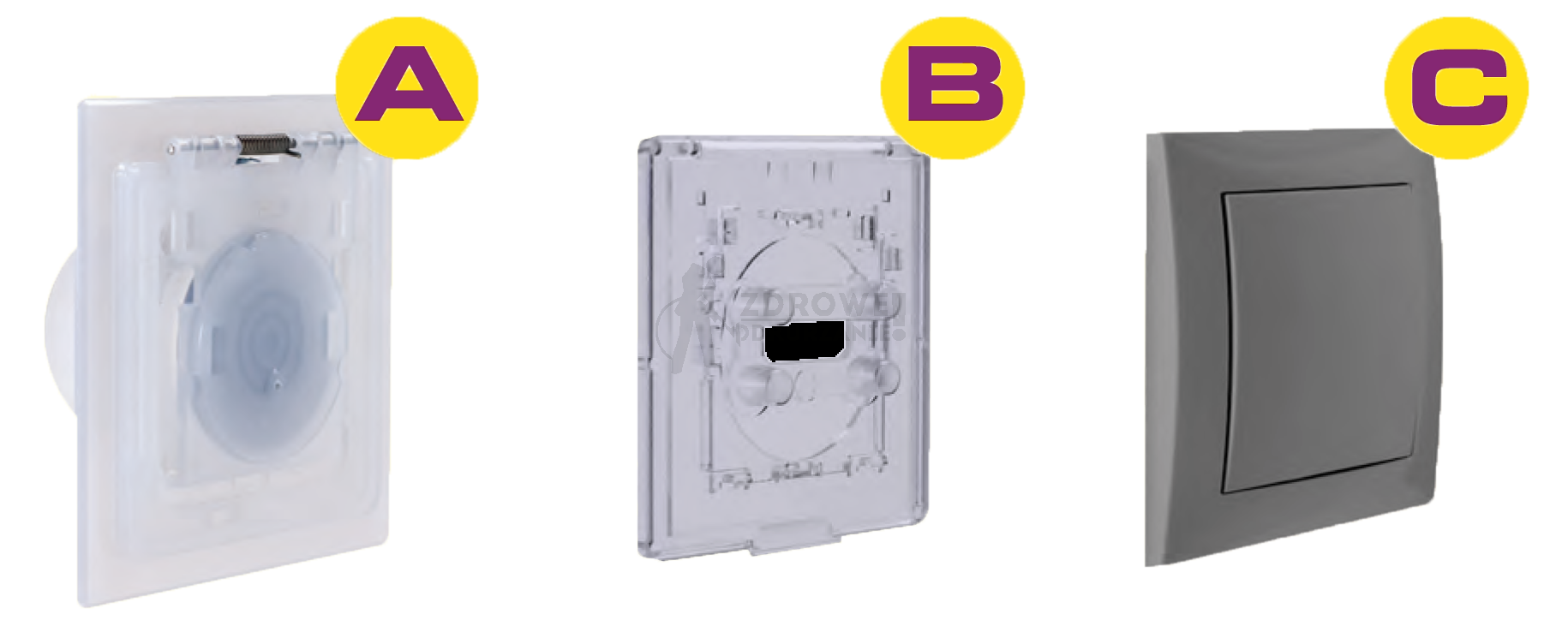 Uwaga!!! Każdy adapter z serii Atomic pasuje do gniazda Atomic (część A) jednak należy zwrócić uwagę aby dopasować adapter do wybranego klawisza przełącznika światła (część C).