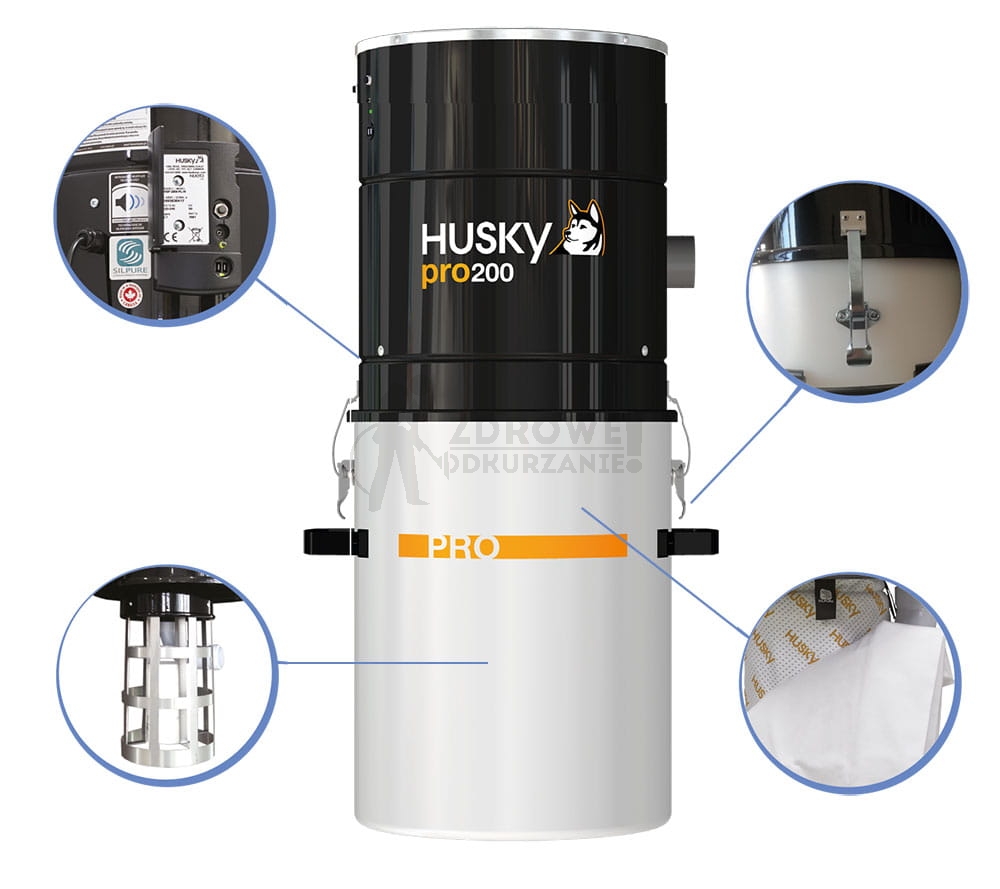 Odkurzacz centralny Husky PRO200 to jednostka, która dzięki zastosowaniu wysokiej klasy silnika uzyskuje 52,3 kPa podciśnienia dzięki czemu skutecznie można czyścić także grube wykładziny czy dywany. Drugim istotnym parametrem odkurzaczy centralnych jest przepływ powietrza, model PRO200 uzyskuje wartość aż 50 l/s – to pozwala na wygodne i szybkie sprzątanie powierzchni twardych jak parkiet, panele czy ceramika – przy takich podłogach przepływ powietrza jest najistotniejszy. Wypadkową podciśnienia i przepływu powietrza jest tzw. moc ssąca odkurzacza, ta wartość w tym modelu wynosi 1100 Air Watt przy mocy elektrycznej urządzenia na poziomie 2981 Watt.