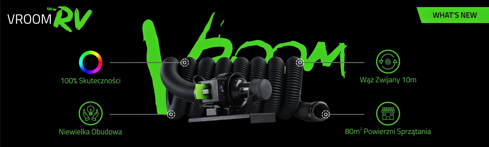 Vroom RV NEW to nowa generacja Vroom. Jego budowa sprawia, że zajmuje bardzo mało miejsca i pozwala na instalacje w miejscach gdzie nie można użyć standardowej kasety. Urządzenie jest cichsze niż jego poprzednicy a przy tym posiada znacznie większą siłę ssącą. W 2 metrowej tubie znajduje się wąż, który możemy rozciągnąć, aż na 10 metrów przez co zasięg Vroom RV NEW wynosi nawet 80m2.