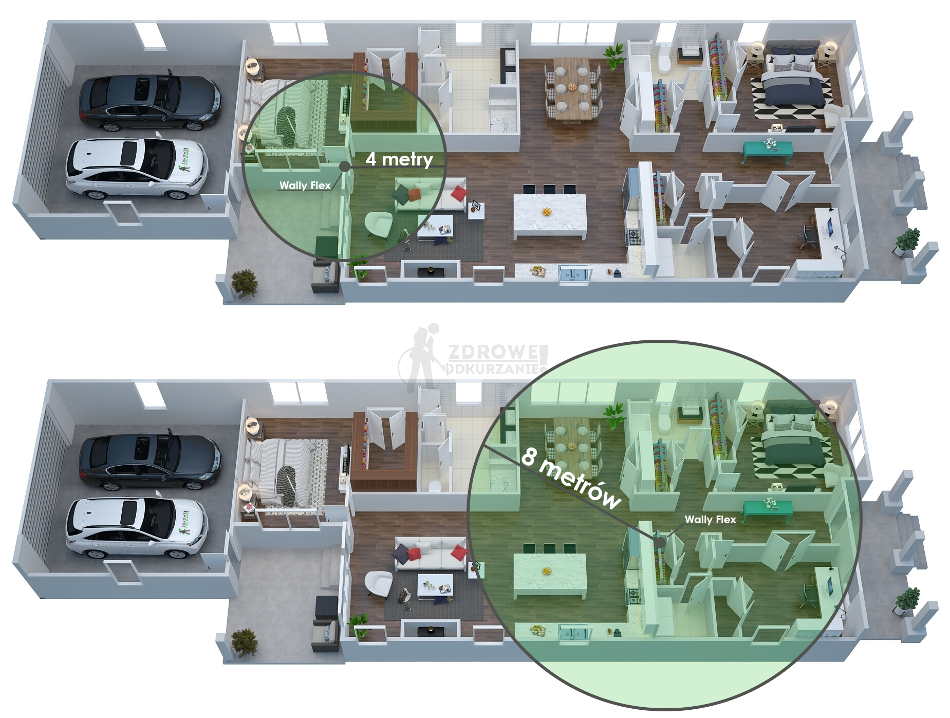Estetyczna i kompaktowa puszka Wally Flex zamontowana na ścianie w Twoim domu zajmie niewiele miejsca, a rozciągnięty wąż sięgnie aż do 8 metrów od miejsca zamontowania - jest więc wystarczająco długi, aby objąć całe pomieszczenie, a niekiedy nawet pomieszczenia przylegające.